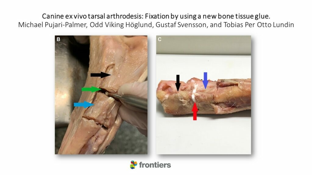 Arthrodesis of the tarsal joint has a high incidence of postoperative complications and intraoperative difficulties. An adhesive that facilitates implant placement and joint alignment, as well as strengthening the internal fixation, could potentially be a useful complementary clinical tool to reduce the risk of complications in these high-risk procedures.