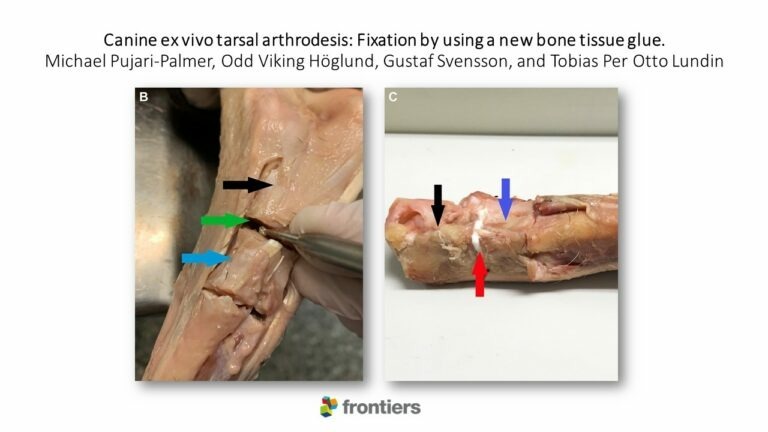 Researchers from the Department of Clinical Sciences, Swedish University of Agricultural Sciences, Uppsala, Sweden (SLU) and the Department of Surgery, Blå Stjärnans Djursjukhus, Gothenburg, Sweden; Michael Pujari-Palmer, Odd Viking Höglund, Gustaf Svensson, and Tobias Per Otto Lundin, recently published a paper which examines the fixation capabilities of OsSticTM technology in a canine ex vivo tarsal arthrodesis test model. Arthrodesis of the tarsal joint has a high incidence of postoperative complications and intraoperative difficulties. An adhesive that facilitates implant placement and joint alignment, as well as strengthening the internal fixation, could potentially be a useful complementary clinical tool to reduce the risk of complications in these high-risk procedures. In this experimental ex vivo study, a new bone glue – OsSticTM technology, was evaluated as a subchondral bone adhesive. This glue is composed of materials that are present in the body; calcium and silicate, and the amino acid phosphoserine. The biomechanical model the research group developed was sensitive enough to measure differences in fixation strengths between different glue formulations. The average fixation strength was 60–100 N/cm2, which should be strong enough to support short-term load bearing in medium sized canines (20 kg). This demonstrates that this new resorbable glue – OsSticTM, can potentially contribute to stability at arthrodesis surgery, acting as a complement to today’s standard fixation, metal implants. Read the full publication here.